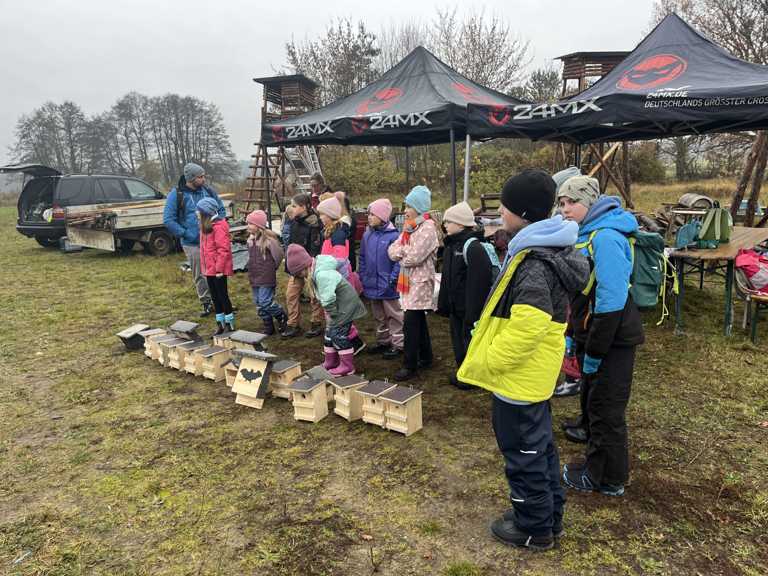 Kinder der AG Junge Naturforscher an der Comenius Grundschule Oranienburg versorgen Vögel und Fledermäuse im Wald mit selbstgebauten Nisthilfen